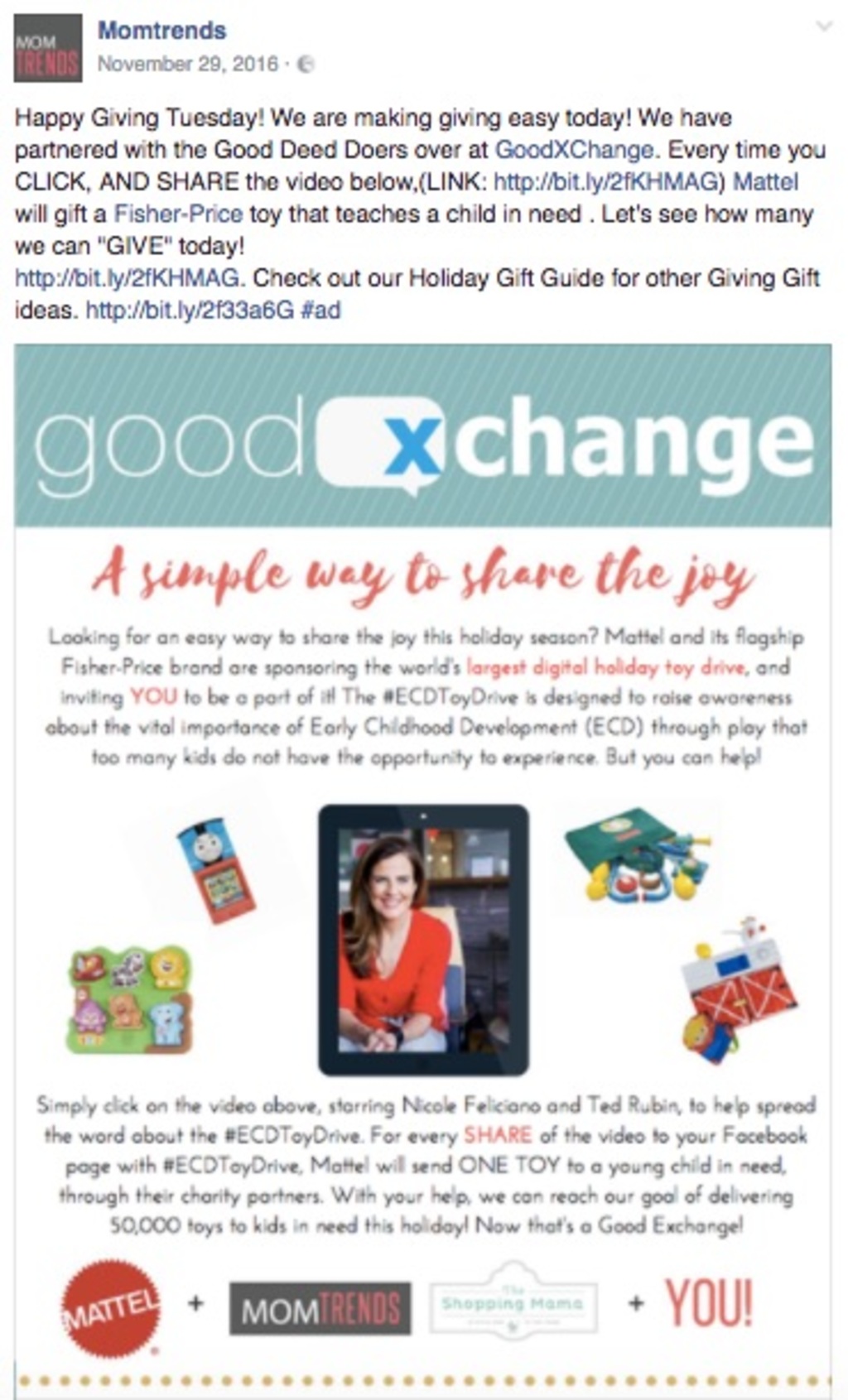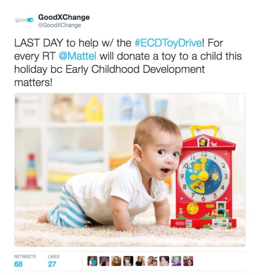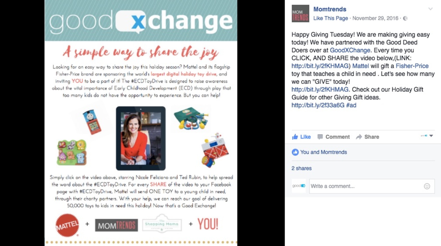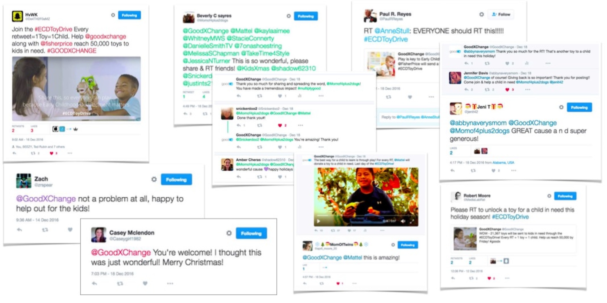 We decided to create a GoodXChange that benefitted these kids in need, with the amazing support from Fisher-Price and Mattel. With the help of our community, we set off to create a series of assets and videos that they could engage with, and through this unlock marketing dollars that would go to the cause. We called this the #ECDToyDrive - the largest digital toy drive in the world.