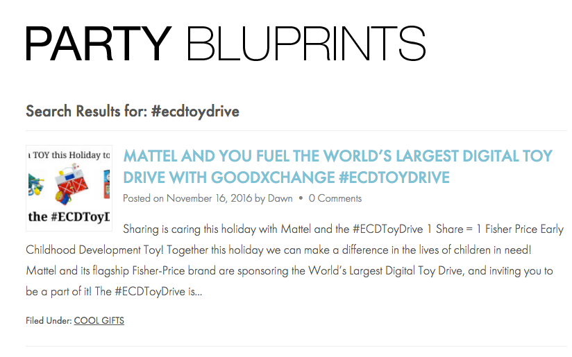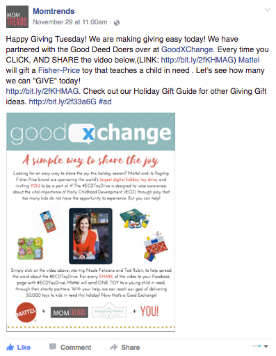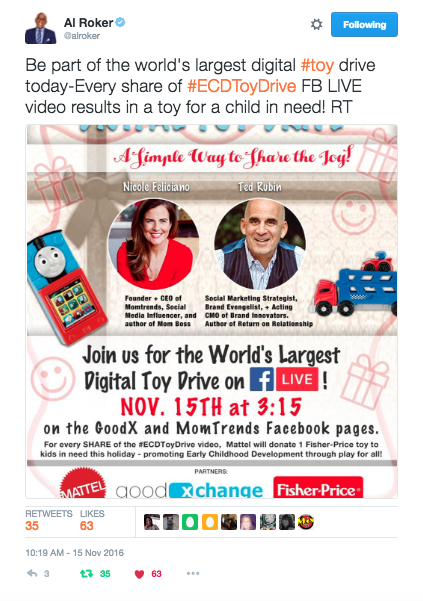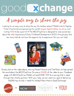GoodXChange partnered with Mattel and Fisher-Price to create digital opportunities for people to spread awareness of ECD, in exchange for a Fisher-Price toy to be donated to a child in need during the 2016 holiday season.
